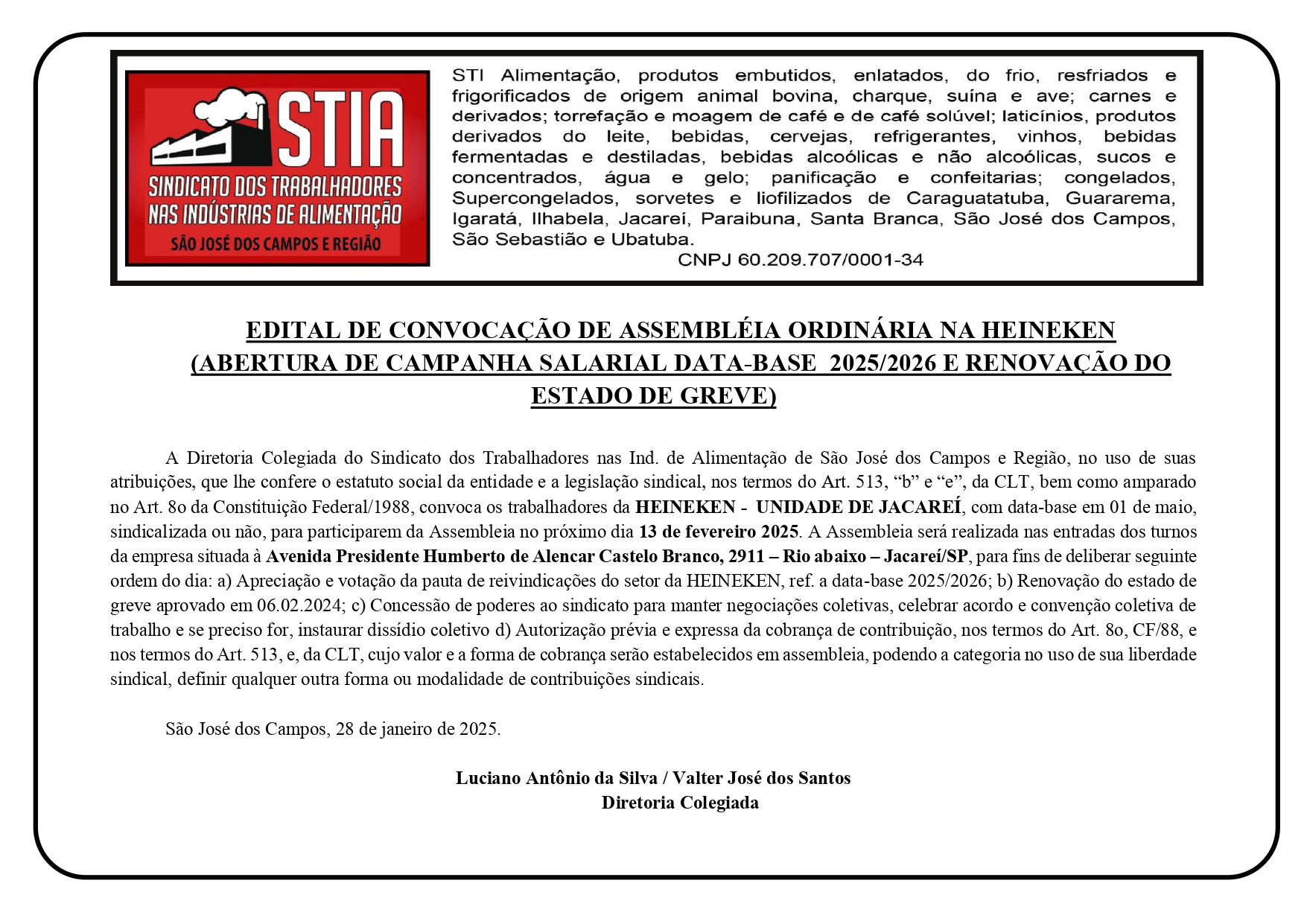 EDITAL DE CONVOCAÇÃO DE ASSEMBLÉIA ORDINÁRIA – DATA BASE 2025/2026 – HEINEKEN (ABERTURA DE CAMPANHA SALARIAL DATA-BASE 2025/2026 E RENOVAÇÃO DO ESTADO DE GREVE) Equipe STIA2025-02-04T18:53:37+00:00 Compartilhe isso com outros companheiros! FacebookWhatsAppEmail Artigos Relacionados Trabalhadores da Masterfoods em Guararema são convocados para assembleia sobre renovação da escala 6×2 5ª ATUALIZAÇÃO E ENCERRAMENTO DA LISTA – PROCESSO Nº 0001227-74.2011.5.15.0138 (PERICULOSIDADE E INSALUBRIDADE – HEINEKEN) Sindicato convoca trabalhadores da Heineken para Assembleia que votará acordo judicial Sindicato convoca trabalhadores dos setores de massas, chocolates, balas, biscoitos e congelados para votar a CCT 2025/2026. Deixe um comentário Cancelar respostaComentar