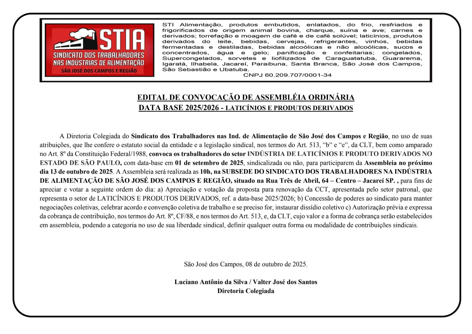 O Sindicato dos Trabalhadores nas Indústrias de Alimentação de São José dos Campos e Região (STIA) convocou todos os trabalhadores do setor de laticínios e produtos derivados para participarem de uma assembleia ordinária no dia 13 de outubro de 2025, às 10h, na sub-sede do sindicato em Jacareí, localizada na Rua Três de Abril, 64, Centro.
